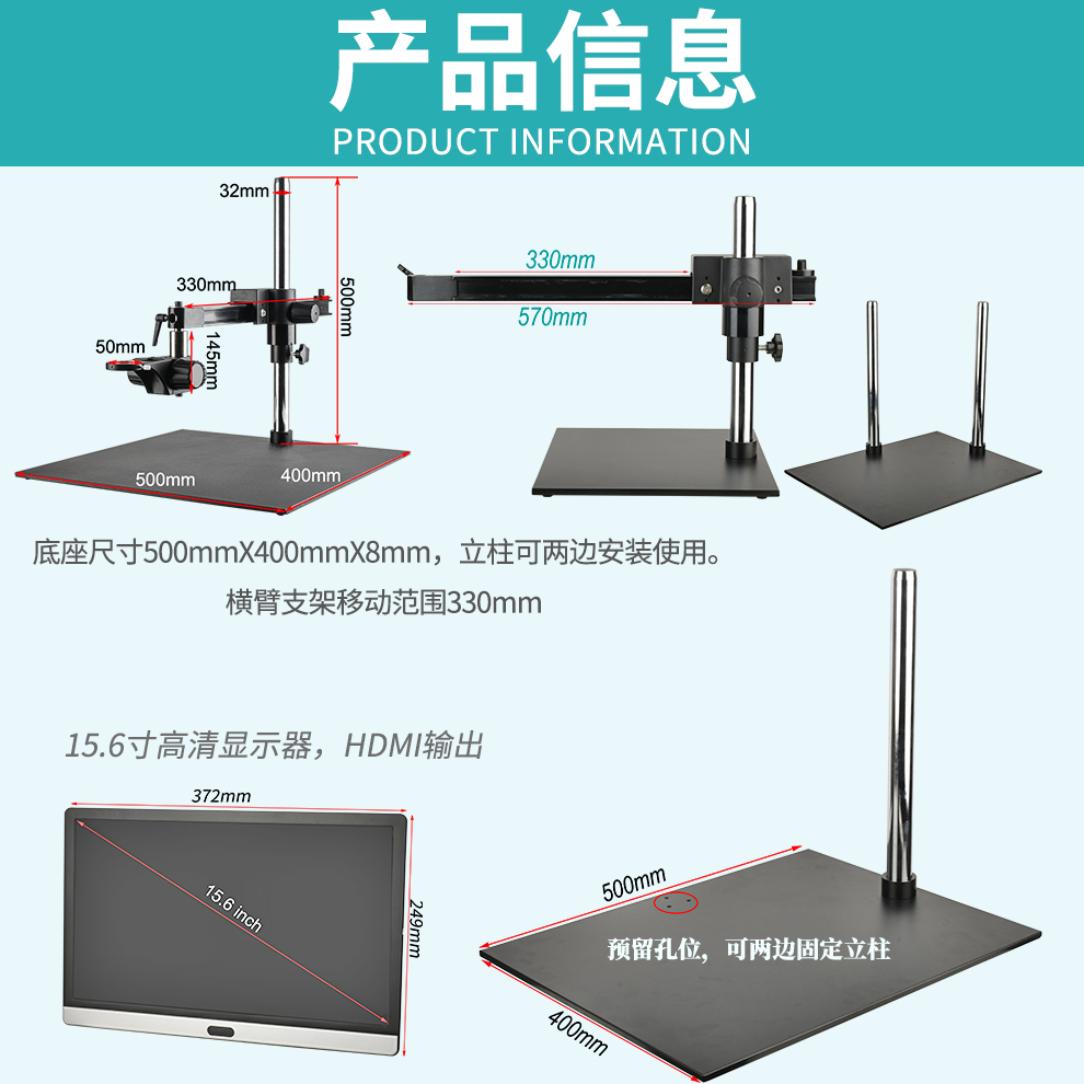 | 支架 | 横臂支架移动范围:330mm,立柱高500mm, 底座尺寸500mmX400mmX8mm,镜头孔径50mm |