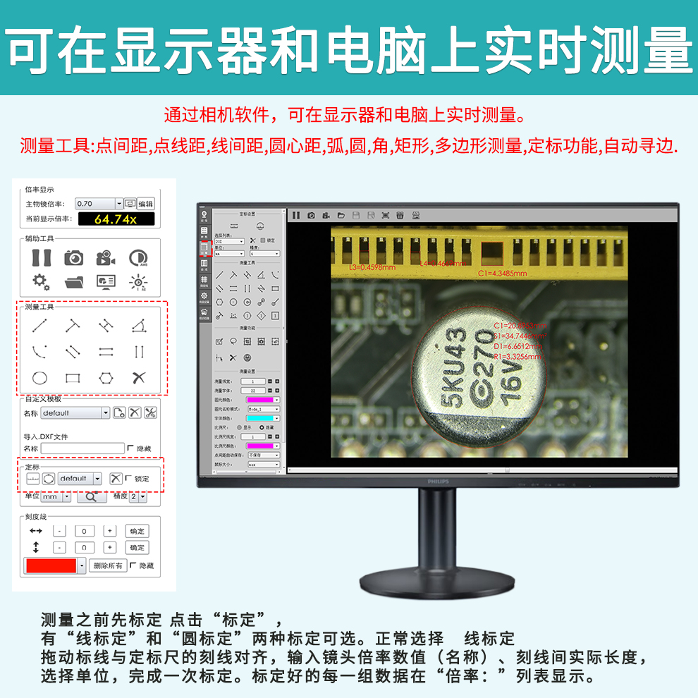 | 测量功能 | 点间距,点线距,线间距,圆心距,弧,圆,角,矩形,多边形测量,定标功能,自动寻边。 |
