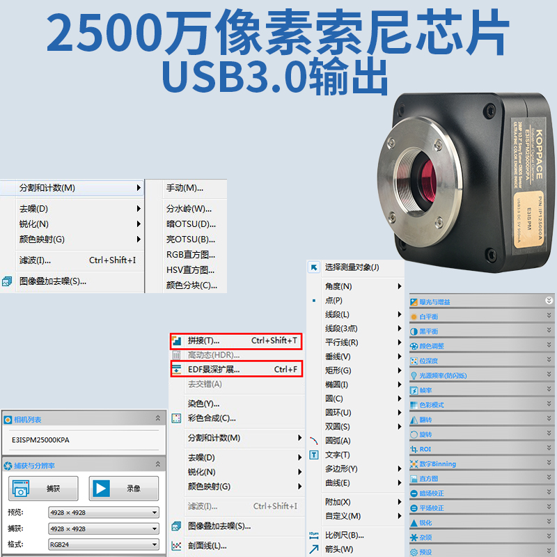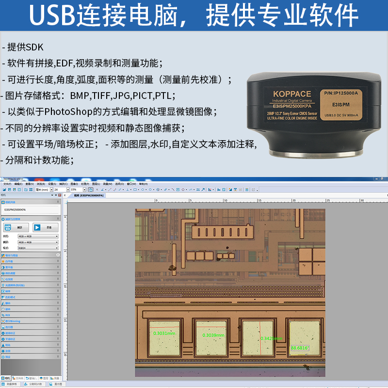 | 相机功能 | 提供SDK - 提供拼接,EDF,视频录制和测量功能; 进行长度,角度,弧度,面积等的测量; 图片存储格式:BMP,TIFF,JPG,PICT,PTL; |