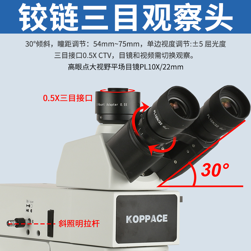 | 观察筒 | 30° 倾斜,倒像,铰链式三目观察筒,瞳距调节范围54-75mm |
