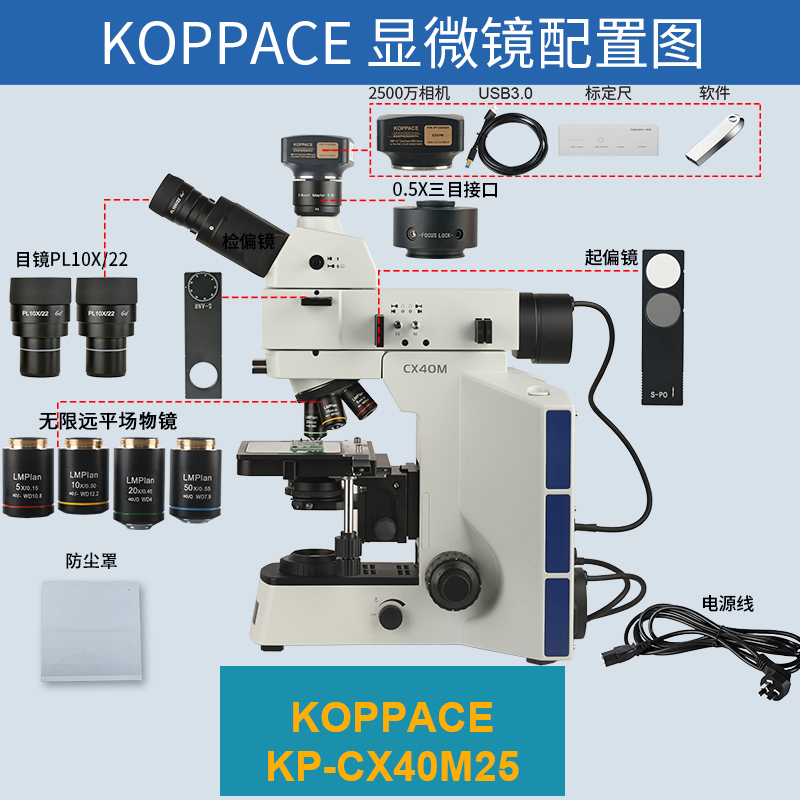 | 包装清单 | 1、目镜PL10X/22一对 2、物镜 LMPlan 5X *1 3、物镜 LMPlan 10X *1 4、物镜 LMPlan 20X *1 5、物镜 LMPlan 50X *1 6、显微镜镜体* 1 7、三目镜头 *1 8、0.5X接口 *1 9、电源线 *1 10、起偏镜 *1 11、检偏镜 *1 12、防尘罩 *1 13、2500万像素USB相机 *1 14、1.8m USB线 *1 15、图像软件 *1 16、测量标尺 *1 |