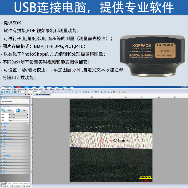 相机功能 | 适用于Windows的高级软件: - 提供SDK - 提供拼接,EDF,视频录制和测量功能; - 进行长度,角度,弧度,面积等的测量; |