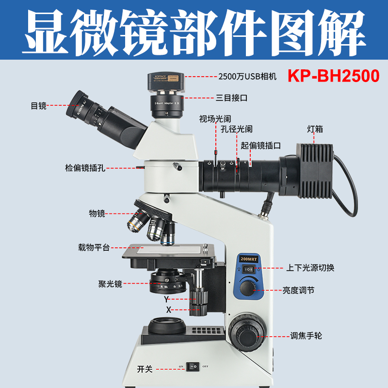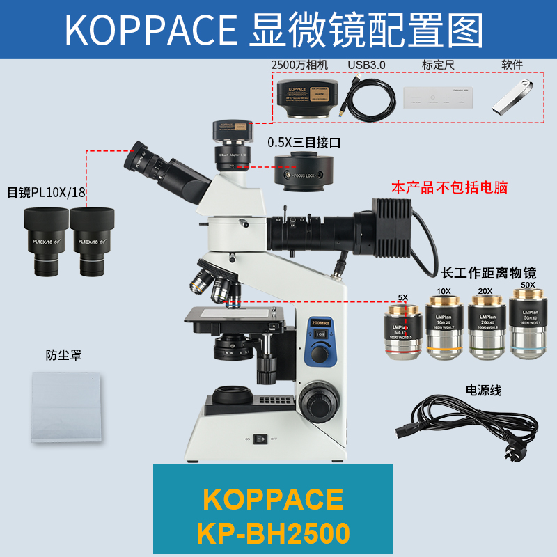 包装清单 | 1、目镜PL10X/18mm一对 2、物镜5X *1 3、物镜10X *1 4、物镜20X*1 5、物镜50X *1 6、显微镜体 *1 7、0.5X三目接口 *1 8、电源线 *1 9、防尘罩 *1 10、2500万像素USB3.0相机 *1 11、USB3.0线 *1 12、软件 *1 13、校准尺 *1 |