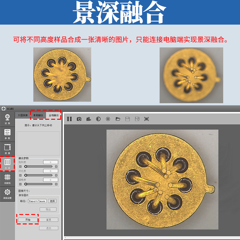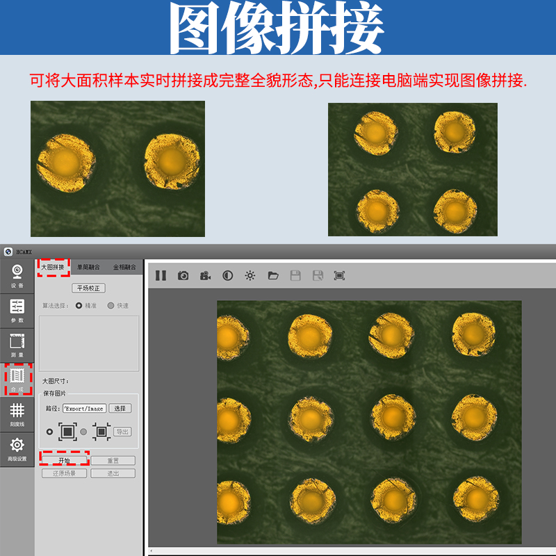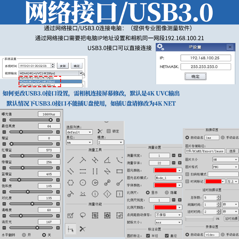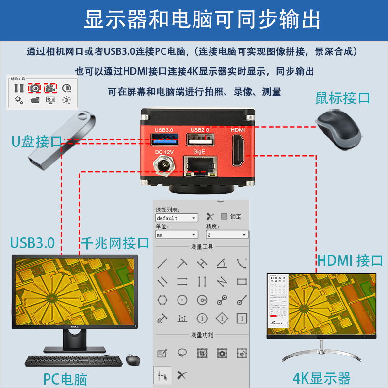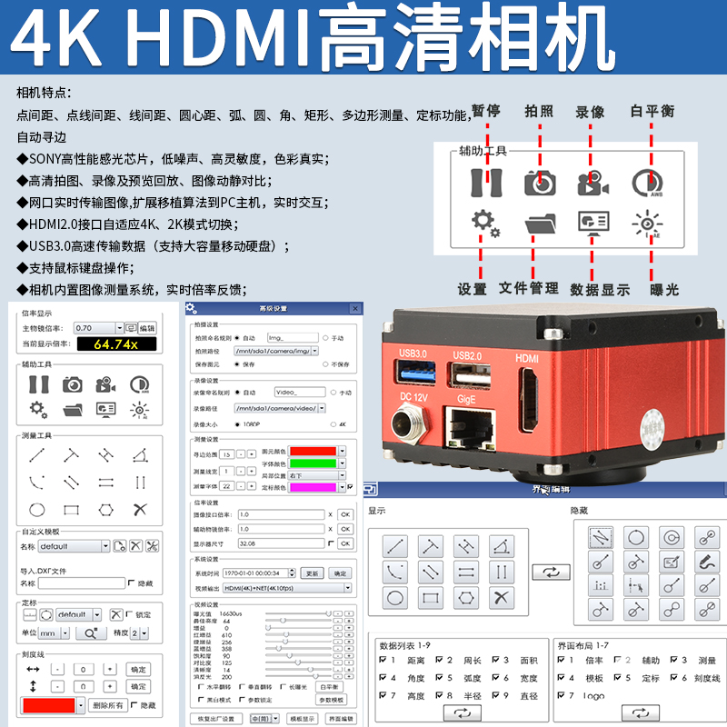 | 网口/USB3.0 | 通过网口或者USB3.0接口连接电脑,可以实现图像拼接和景深合成。 |