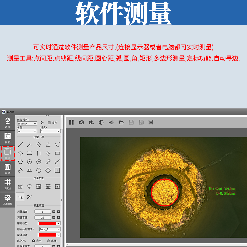 | 测量功能 | 点间距,点线距,线间距,圆心距,弧,圆,角,矩形,多边形测量,定标功能,自动寻边。 |