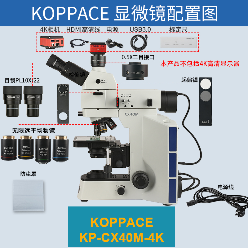 | 包装清单 | 1、目镜PL10X/22一对 2、物镜 LMPlan 5X *1 3、物镜 LMPlan 10X *1 4、物镜 LMPlan 20X *1 5、物镜 LMPlan 50X *1 6、三目镜头 *1 7、0.5X接口 *1 8、电源线 *1 9、起偏镜 *1 10、检偏镜 *1 11、防尘罩 *1 12、4K相机 *1 13、HDMI高清线 *1 14、USB3.0线 *1 15、测量标定尺 *1 16、相机电源 *1 |
