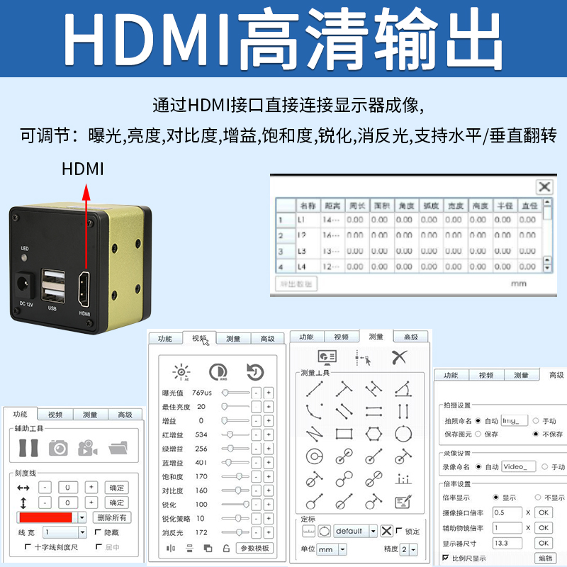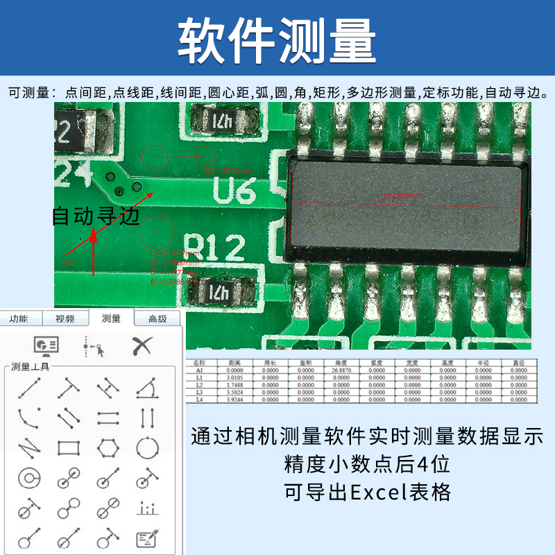 测量功能 | 点间距,点线距,线间距,圆心距,弧,圆,角,矩形,多边形测量,定标功能,自动寻边。 |