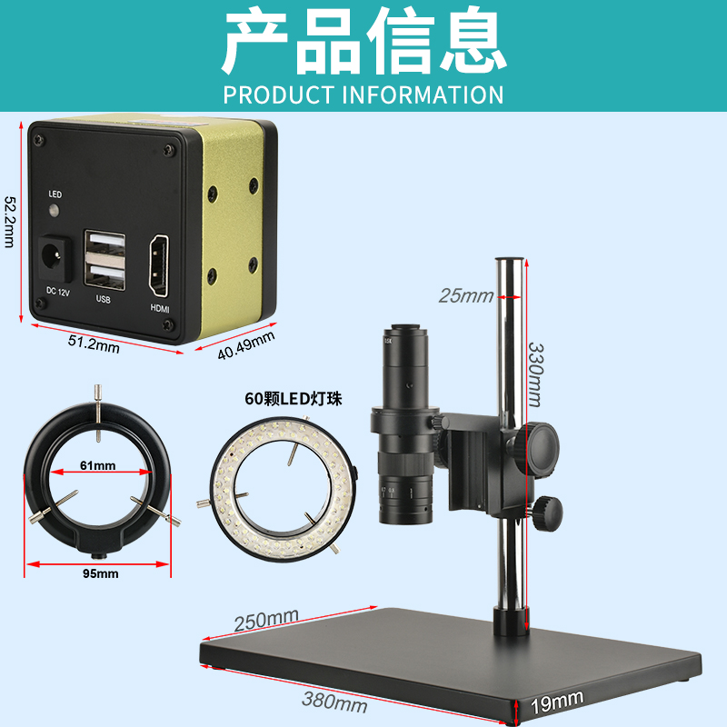 底座 | 底座尺寸380mmX250mmX19mm,调焦架中心距离140mm, 镜头孔50mm,升降范围62mm,立柱高330mm,直径25mm |