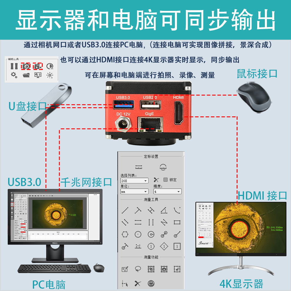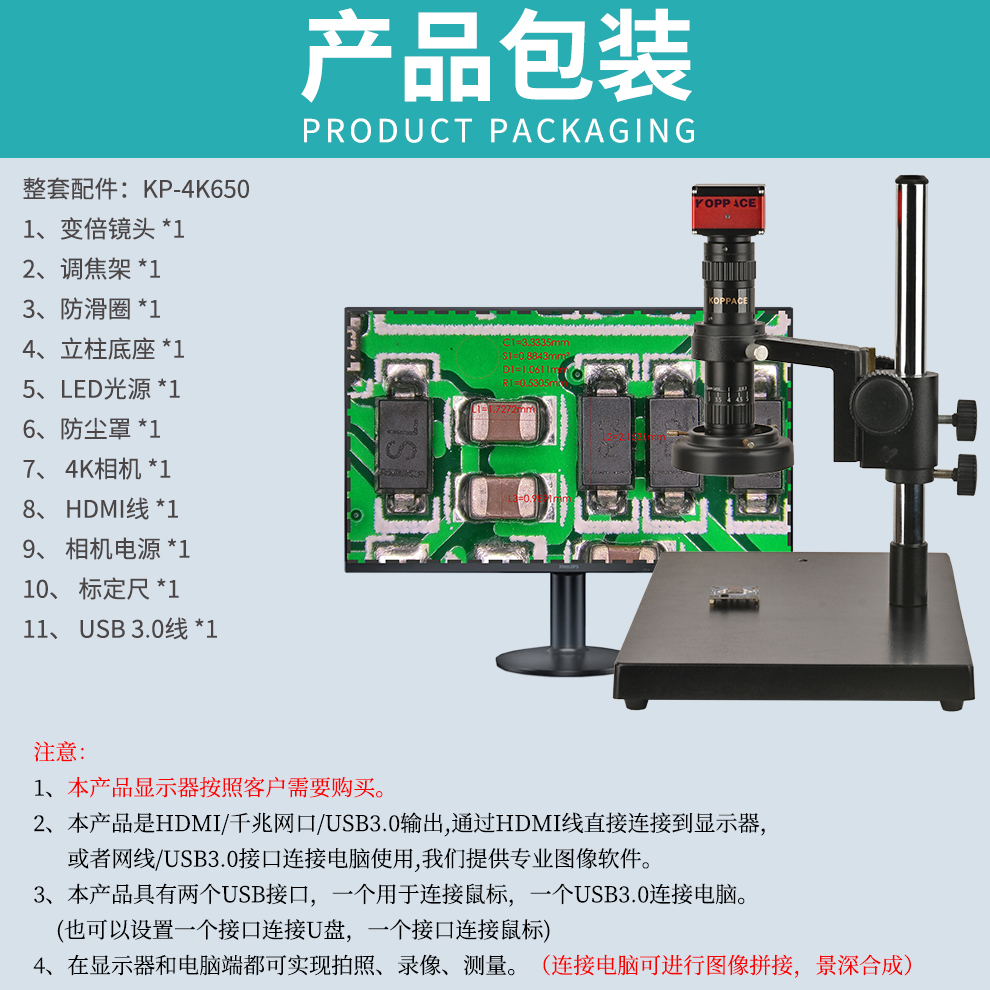 | 注意 | 1. 本产品为HDMI/LAN /USB3.0输出,通过HDMI线直接连接到显示器上,或通过网线/USB3.0接口连接到电脑上使用,连接电脑可以图像拼接,景深合成。 2. 该产品有两个USB接口,一个用于连接鼠标,另一个USB 3.0用于连接计算机。(也可以设置USB接口和鼠标接口)。 3. 拍照、录像和测量都可以在显示器和计算机上实现。 4. 本产品不含显示器。 |
