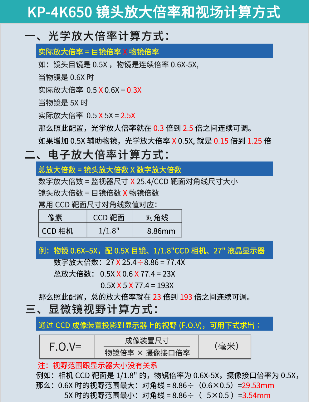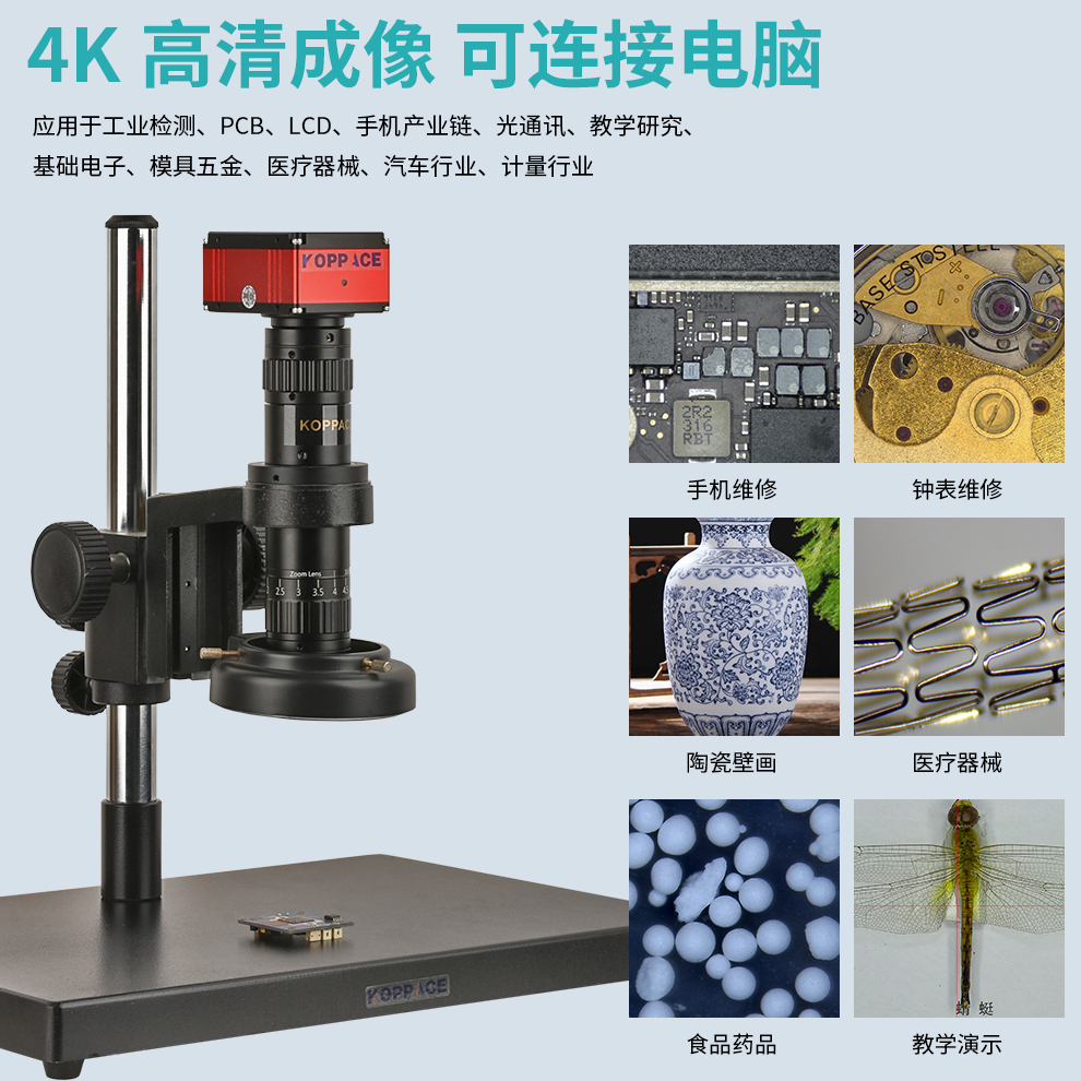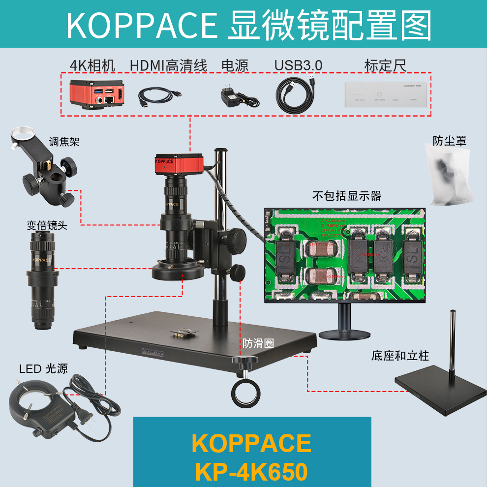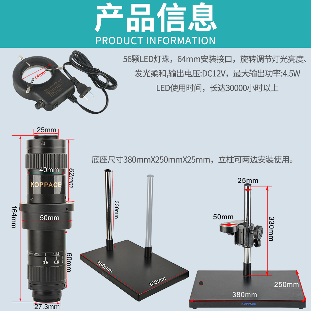 | 包装清单 | 1. 立柱和底板 *1 2. 调焦架 *1 3. 防滑圈 *1 4. 连续变倍镜头 *1 5、LED环形灯 *1 6、防尘罩 *1 7、4K相机 *1 8、HDMI线 *1 9、相机电源适配器 *1 10、校正尺 *1 11、USB 3.0线 *1 |