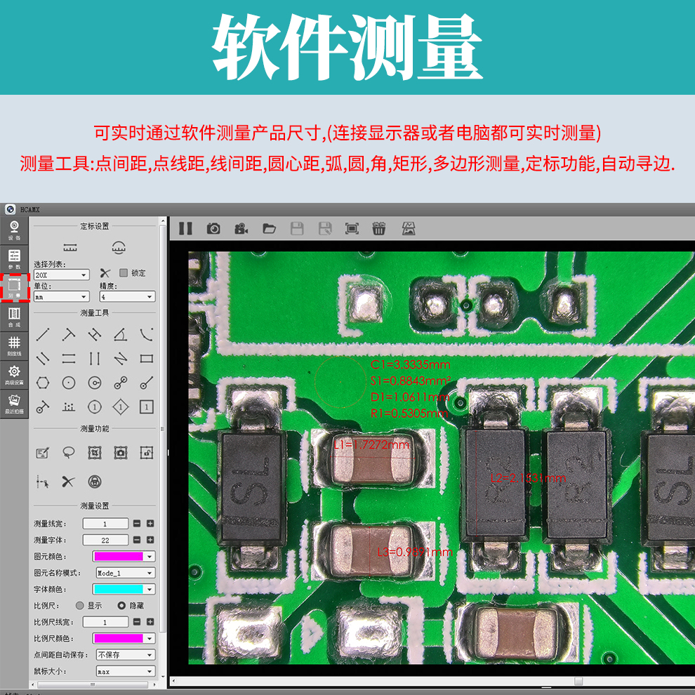 | 测量功能 | 点间距,点线距,线间距,圆心距,弧,圆,角,矩形,多边形测量,定标功能,自动寻边。 |