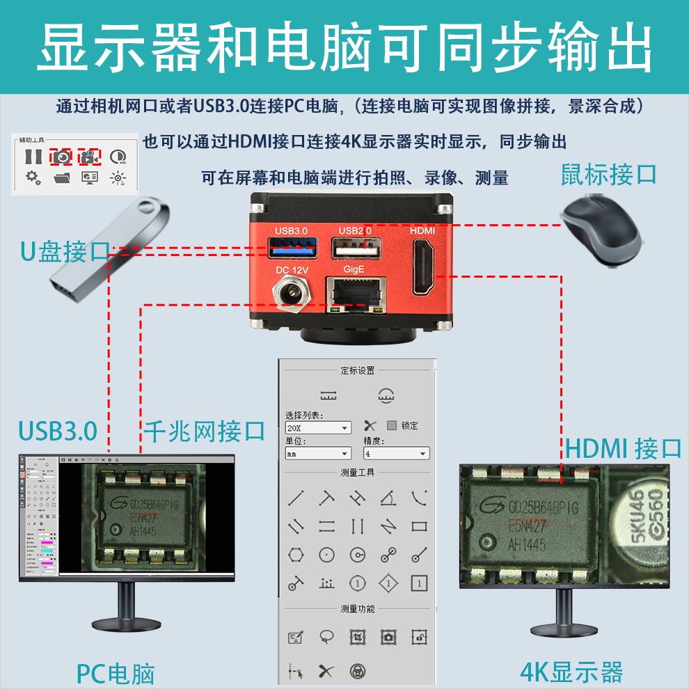 | 注意 | 1. 本产品为HDMI/LAN /USB3.0输出,通过HDMI线直接连接到显示器上,或通过网线/USB3.0接口连接到电脑上使用,连接电脑可以图像拼接,景深合成。 2. 该产品有两个USB接口,一个用于连接鼠标,另一个USB 3.0用于连接计算机。(也可以设置USB接口和鼠标接口)。 3. 拍照、录像和测量都可以在显示器和计算机上实现。 4. 本产品不含显示器。 |