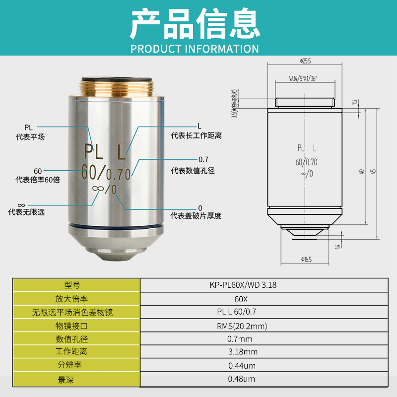 KOPPACE 60X无限远平场消色差金相物镜 安装接口20.2mm