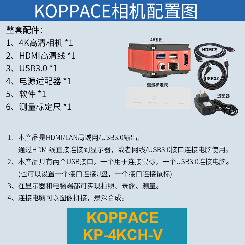 注意 | 1、本产品是HDMI/LAN局域网/USB3.0输出, 通过HDMI线直接连接到显示器,或者网线/USB3.0接口连接电脑使用。 2、本产品具有两个USB接口,一个用于连接鼠标,一个USB3.0连接电脑。(也可以设置一个接口连接U盘,一个接口连接鼠标) 3、在显示器和电脑端都可实现拍照、录像、测量。 4、连接电脑可以图像拼接,景深合成。 |