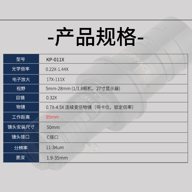 KOPPACE 95mm工作距离高清工业镜头连续变倍物镜