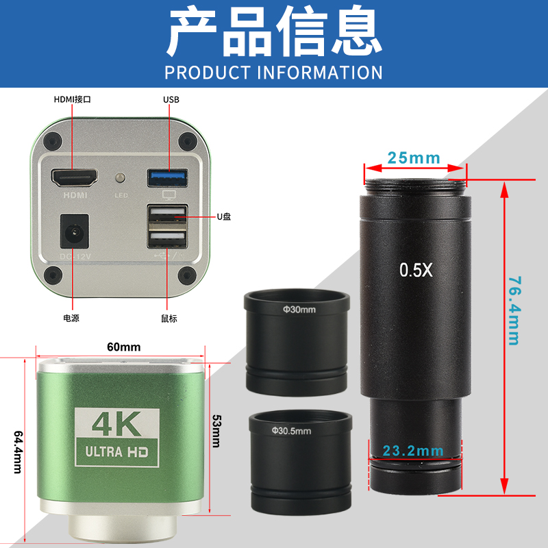 | 装箱单 | 1、4K相机 *1 2、HDMI线 *1 3、USB线 *1 4、软件 *1 5、电源 *1 6、鼠标 *1 7、测量标定尺 *1 8、0.5X C-Mount接口适配器 *1 9、环形适配器30mm *1 10、环形适配器30.5mm *1 |